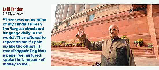 Politicians also feel that they come under pressure from media houses, wherein if they don’t pay, they get poor coverage. For instance, when BJP MP Lalji Tandon found zero mention of his campaign in the keenly-watched Lucknow seat in the “largest-circulated language daily in the world”, all he had to do was to put a call and seek the reason why. Simple, he was told, he had to pay up. Says Tandon, “It was disappointing to note that a paper whose success is partly attributed to us (the BJP) could be actually speaking the language of money to me.” Tandon, who went on to win subsequently, swears that he didn’t pay for coverage, though his BSP rival did.