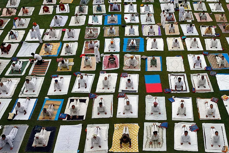 And what we will witness in the Indian capital on June 21 will be the outcome of the strivings of some hundreds of bureaucrats who serve the Modi government. They have been issued orders to make the event worthy of an entry in the Guinness Book of World Records under the “largest yoga demonstration at a single venue”. The target is 45,000 people. The PM himself is tweeting the asanas. TV stations have been persuaded to run free commercials about the big day. No harm done, but does yoga need to be remembered through an entry in a book of records? Says yogacharya Bimal from the Bihar school at Munger, who teaches in Delhi: “Yoga is organically born from the culture of India. It’s okay to tell people about the benefits of yoga, but a true practitioner stays away from the loud publicity and tamasha. That is about ego, not yoga. If Modi is trying to say it is only a Hindu tradition, then he is narrowing the scope of yoga.”