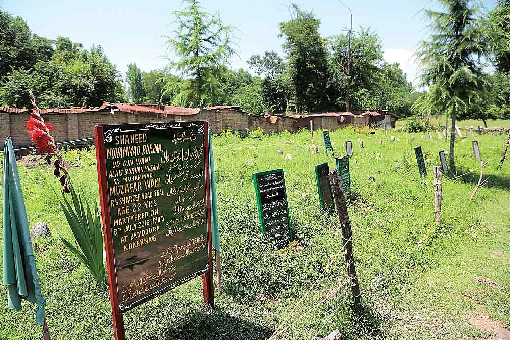 A t the martyrs’ graveyard in south Kashmir’s Tral town, two boys stood silently by the grave of Burhan Wani, the 22-year-old who was killed by government forces in an encounter on July 8 last year in Kokernag. The boys, seventh-grade students at the local government school, raise their hands and pray for Burhan. Then they move aside and talk about the “healing power” of the soil of his grave. “People from far and wide come here and take handfuls of this soil,” says one of them. “They believe it can cure disease. My ailing mother asked me to get some soil from Burhan’s grave. She rubbed it on her face and instantly felt much better.”