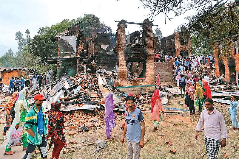 A small lane leads towards New Colony in Kakpora where an elderly Abdul Bhat and his two sons are standing beside heaps of bricks and dirt that once used to be his three-storey house. “On June 21, three militants came here after they were chased by the army. I was in hospital with one of my daughters. We didn’t know the militants had entered our house. We saw only their charred bodies,” says Bhat, who has filed no FIR and expects no compensation. Neighbours say the house was blasted several times during the night. Even the trees around it were burnt. “The militants burnt in the fire. There were no bodies, just burnt skeletons,” says a woman.