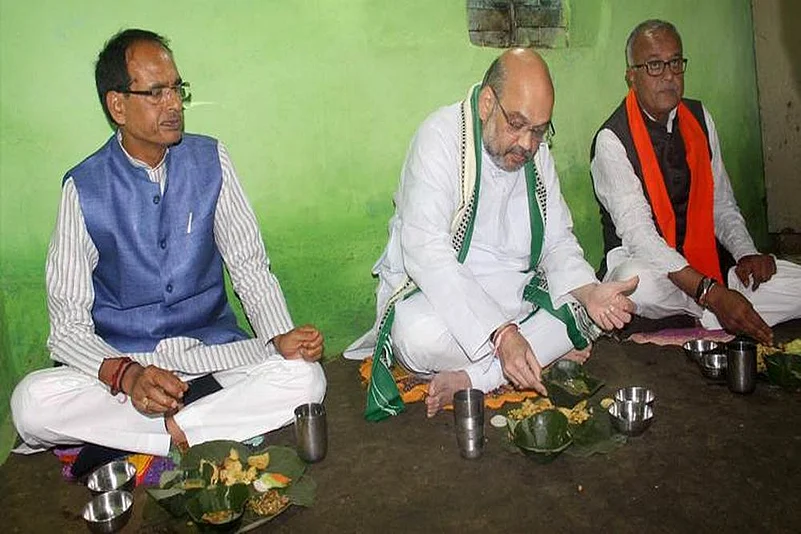 The Congress' allegation came hours after Shah, flanked by Madhya Pradesh chief minister Shivraj Singh Chouhan and state party president Nandkumar Chauhan, had daal-baati, baigan bharta, Kadi-chaval and sweets during lunch at Kamal Singh Uike's house in Sevania-Gaud area.