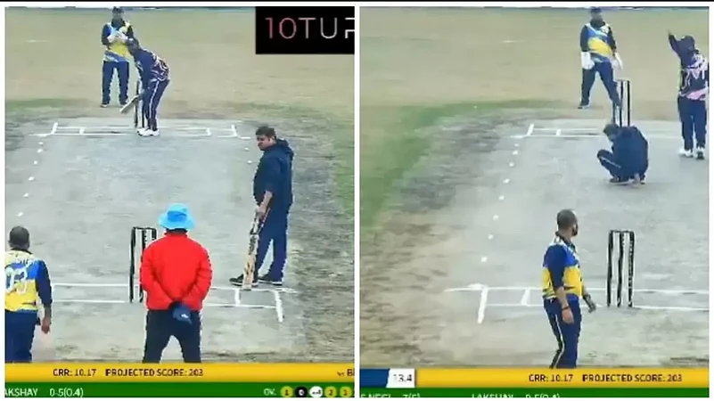 The footage shows Vikas Negi running towards the other side of the pitch to take a run and collapsing midway, prompting others on the field to rush towards him.