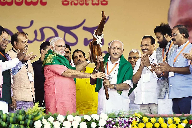 Five years ago, when the BJP went to elections in Karnataka as the ruling party, things were at the party’s ebb—a ‘suicidal moment’ as one insider put it. Its voteshare had fragmented into three pieces and its image severely dented, in stark contrast to a Modi wave sweeping across the country at the time. In the years since, the graph of its best-known face in Karnataka has been on the upswing: B.S. Yeddyurappa clawed his way back into the party to become its state chief. Now, as the rhyming slogan goes, the ‘vikas jodi’ (pair) in Karnataka is ‘Yeddyurappa-Modi’.