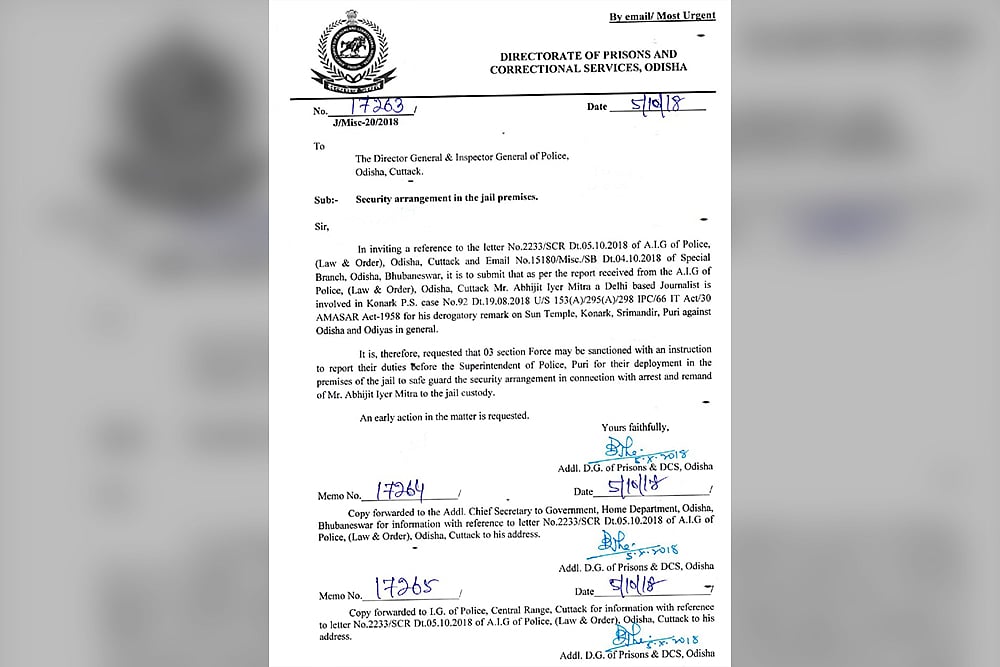 In an official note accessed by Outlook, additional D.G of Prisons, Odisha has asked the Director General and Inspector General of Police (Note No. 17263, Dated 5/10/2018) for extra force to be sanctioned and has asked Superintendent of Police, Puri, within which Konark falls, to make extra security arrangement in connection with the arrest and remand of Iyer-Mitra.