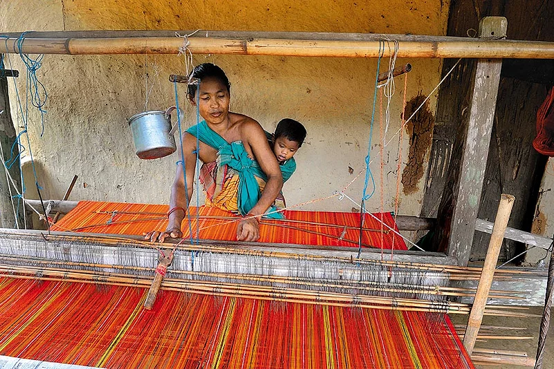 Putting the buckets in a corner, she opens the locked hut. She picks up a stool next to the handloom inside, on which an orange dokhana—a traditional Bodo wraparound for women—is in the process of being woven. Ropi earns from making dokhanas and selling them in the city, while her husband Bakul Basumatary works in a cable factory in Guwahati and visits her every six months.