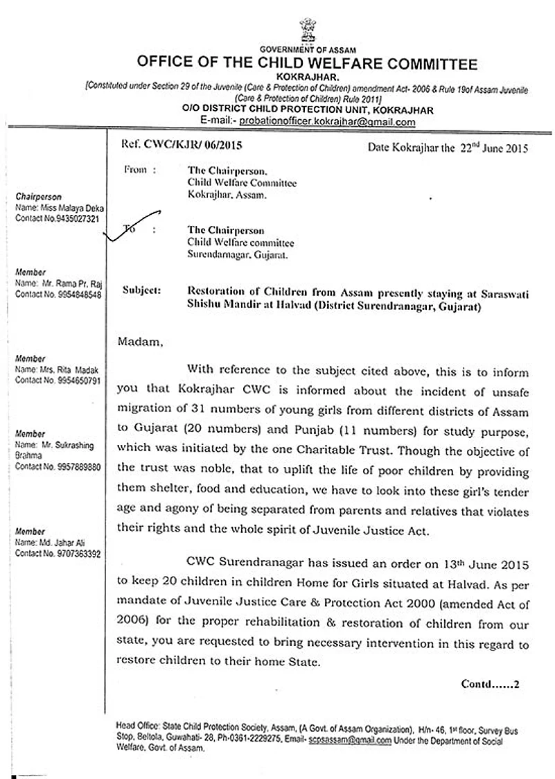 On June 22, 2015, Malaya Deka, the chairperson of CWC, Kokrajhar, wrote a letter(CWC/KJR/06/2015) to the CWC, Surendranagar district, Gujarat, requesting the “restoration of children from Assam staying at Saraswati Shishu Mandir, Halvad, Surendranagar”. The letter says: “...we have to look into these girls’ tender age and agony of being separated from parents and relatives that violates their rights and the whole spirit of Juvenile Justice Act. It will be convenient for you to bring children to Guwahati from where concerned District Child Protection Units will be entrusted to take back children to their families in Kokrajhar.”