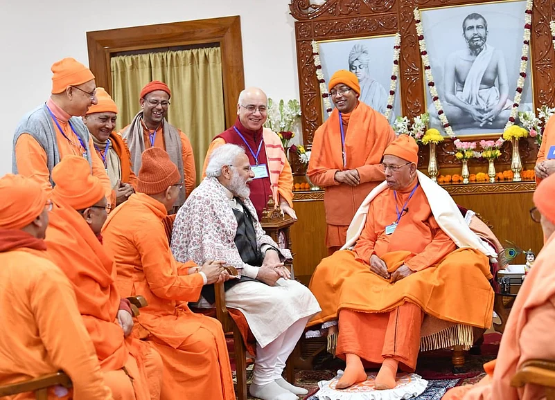 Yesterday, on January 12, the 157th birthday of the Great Saffron One, the arcane prophecy came full circle. The most powerful statesman of the nation visited the ashram headquarters by the Hooghly River, spent the previous night there, and paid his tribute to the turbaned saffron prince in the morning on his birthday.
