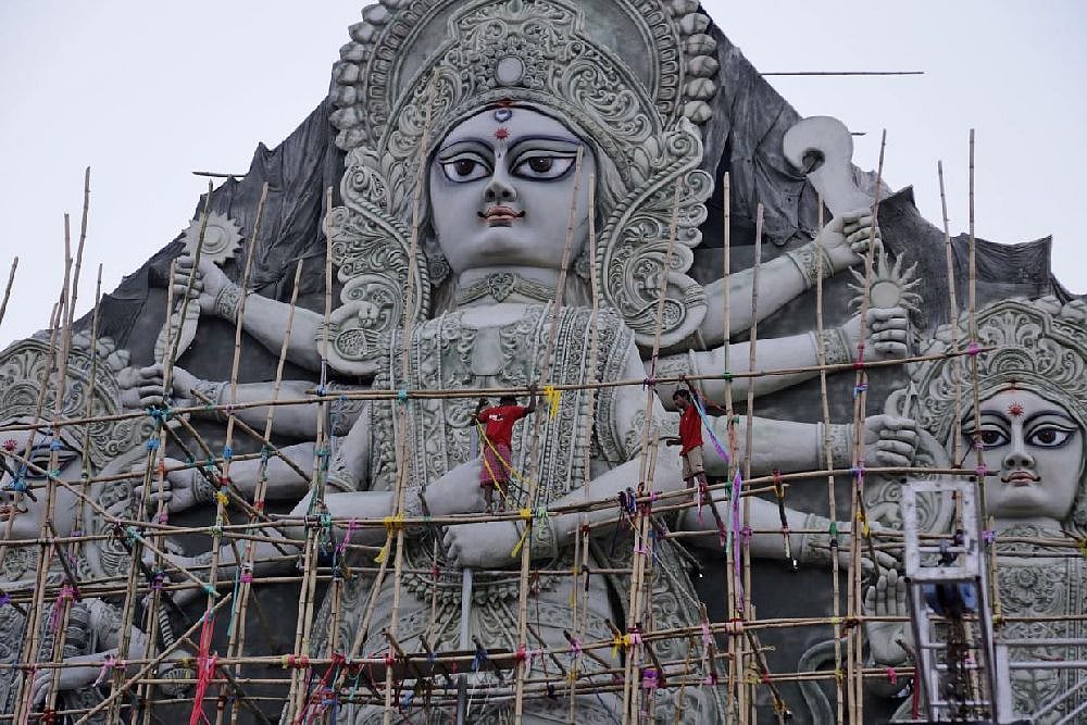 It is the run-up to Durga Puja and the roads are a mass of bamboo. Hammers can be heard in the narrow lanes as the pandal cages spring up, some faster than others. Evening brings snarls of traffic as commuters and sightseers jostle for space. At the end of it is a city filled with art installations – the craftsmanship of weeks of work suddenly on display for a few fleeting days before being dismantled with no record barring photographs and the name of the craftsmen, except in a few cases, anonymous. What a waste some people might say, while others sniff that whatever it is, it is not a religion and is, therefore, a waste of time.