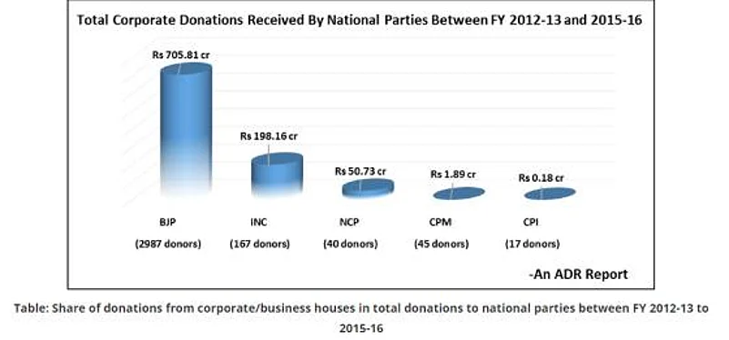 Political parties received Rs 956.77 crore from corporates between 2012/13 and 2015/16 with the BJP pocketing Rs 705.81 crore out of it.