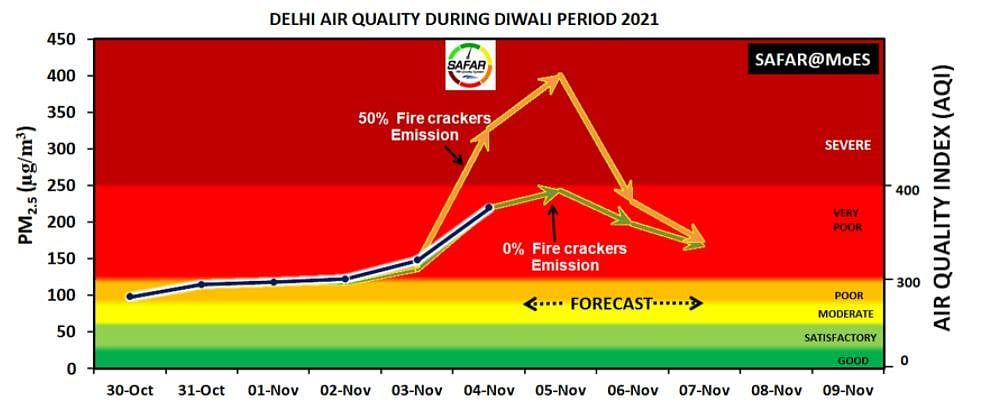 As of yesterday, System of Air Quality And Weather Forecasting And Research (SAFAR) had predicted that while the overall air quality of Delhi was plunged into the upper end of very poor category (within 5% accuracy). It will continue to fall now and may enter at the edge of very poor to Severe category by Diwali midnight even without any emission from fire crackers – a prediction which today morning’s data substantiated.
