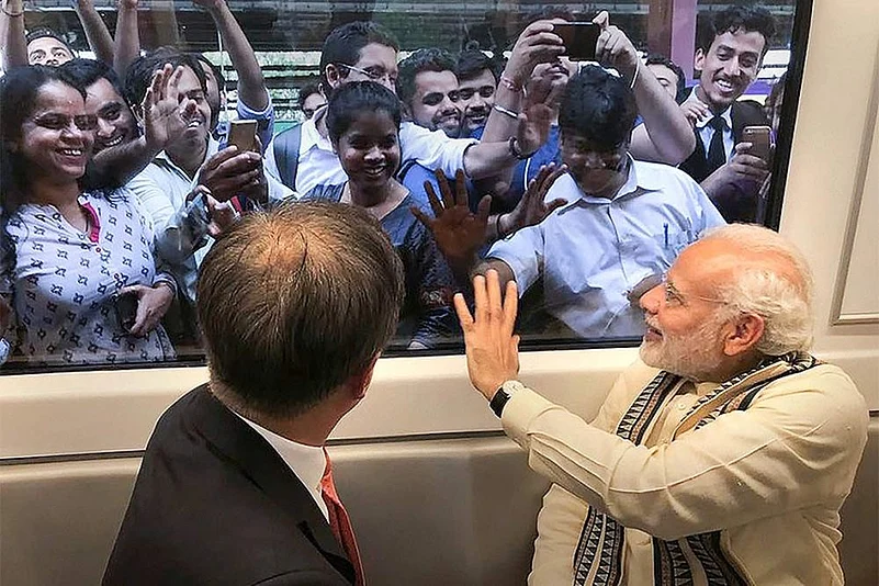 The prime minister's office (PMO) tweeted a picture of the two leaders travelling on the Delhi Metro.
