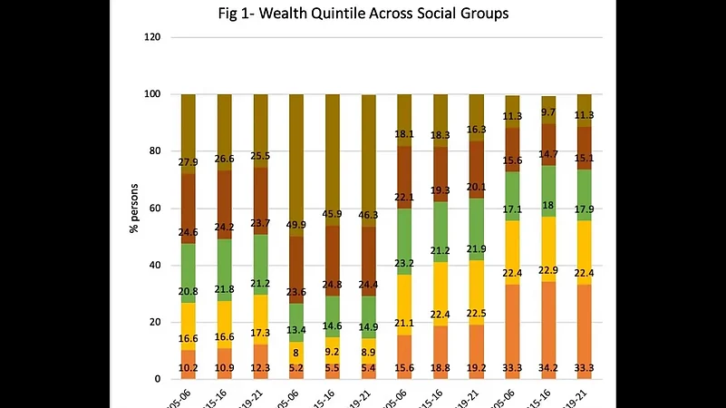In comparison to the ‘other’ group, often synonymous to being privileged, the share of the Scheduled Castes and Scheduled Tribes is higher in the poorest wealth quintile, and lowest in the higher wealth quintile. While poverty has declined across social groups, among the marginalised populations, the share of population in higher wealth quintile has changed comparatively at a slower pace (Fig. 1).