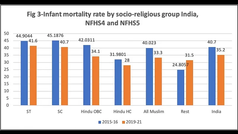 It is often contended that caste cannot be the cause of these variations in nutritional status. They result from socioeconomic factors like mother's education and household wealth, among others. However, the national level data on mortality suggests that children of Scheduled Castes, Scheduled Tribes, and Muslims are more likely to have poor health than the children of the privileged groups (Fig 3).