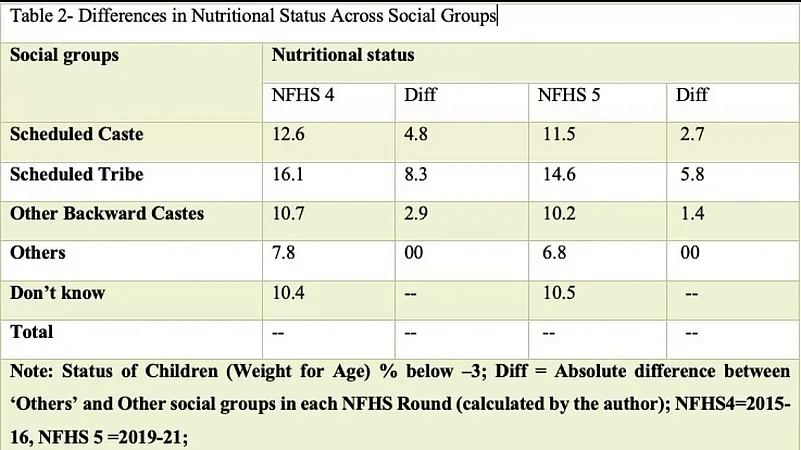 Prevalence of undernutrition among the children across social groups has been favourable to the privileged. The Weight for Age % below –3 SD reflects that while the share of children as well as the difference between the privileged and the marginalised groups has reduced from NFHS 4 to NFHS 5, it is noteworthy that despite various programmes including the largest feeding programme, Integrated Child Development Scheme (ICDS) to the much-highlighted Poshan programme, the nutritional gap remains (Table 2).