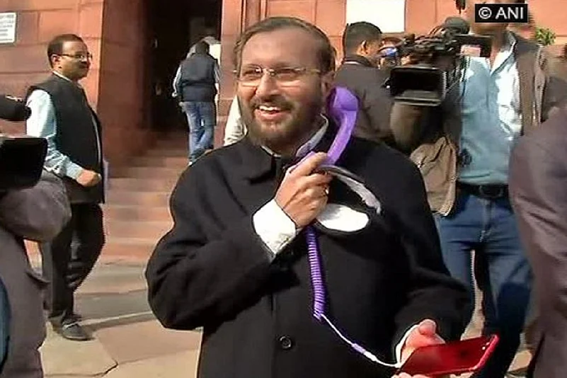 Union Minister Prakash Javadekar was spotted using a landline-receiver in order to avoid the harmful radiation released by mobile phones, outside the Parliament, on Friday.