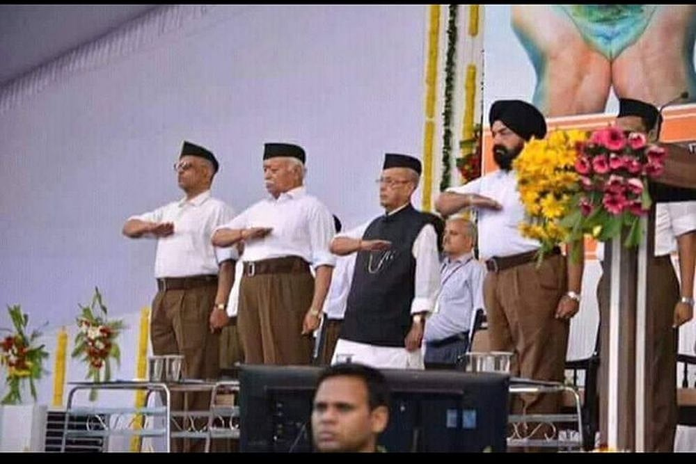 Octogenarian Mukherjee had, at a valedictory ceremony at the RSS headquarter in Nagpur on Thursday evening, stood on the dais, flanked by top Sangh leaders including the organisation’s current chief Mohan Bhagwat, but—unlike the others—with both his hands hung down. Overnight, that image found a fake representation: the 82-year-old Congress veteran is seen having placed his right hand parallel to the ground, with the palm close to his chest in apparent reverence.