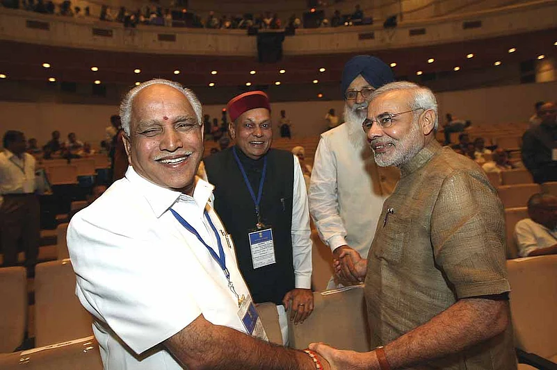 Kumar may have been genuine in his support for Modi with whom he has had a good rapport in the past. But the body language at Goa sent a different message to at least some partymen in the Karnataka BJP. These are people who have felt the ground slipping away from under their feet in the only battleground they know—elections—and are looking at Modi as an opportunity. The recent state polls dwarfed the party by two-thirds (from 119 to 40). These are men who’d still stand up if former CM and state party boss and now rebel B.S. Yediyurappa walked into the room, men who’d still stage a walkout in the assembly with him as if programmed to do so.