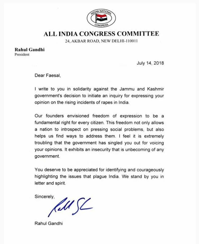 All India Congress Committee President Rahul Gandhi has written to 2010-batch IAS topper Shah Faesal, who was sent a notice by the J&K government for tweeting about increased incidents of rape in the country, praising him for "courageously highlighting the issues that plague India."