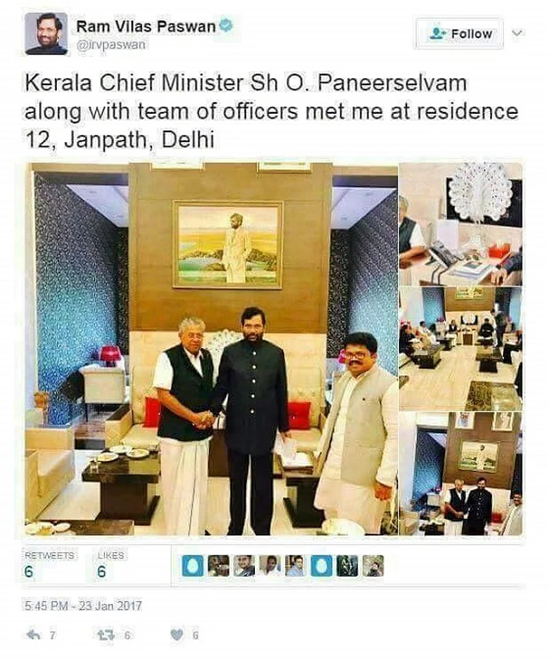 Union Minister Ram Vilas Paswan had a major gaffe after he posted a photo of a meeting with Kerala Chief Minister K Pinarayi Vijayan but posted it on Twitter as a rendevous with O Paneerselvam, who is the CM of Tamil Nadu.