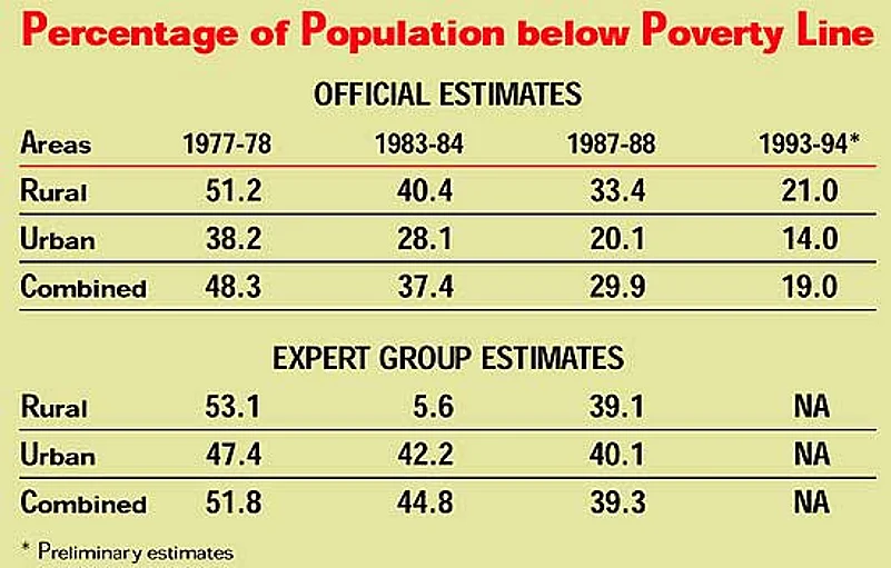 The shortcomings may be serious. "A uniform inflation rate is taken for the entire country which has extremely diverse pockets," says Mathur. "Also, the calorie requirement and the composition of the food basket, which is taken as the same for all, differ from region to region." Moreover, the NSSO data, which is collected directly from the people, is not used as it is, the assumption being that people understate consumption. The NSSO figures are thus suitably increased, guided by the consumption figures churned out by the CSO. This method was sought to be corrected by the Lakdawala Committee—an expert group which came up with substantially higher poverty figures for all the years ( see table ) by using the NSSO data as it came in. With the Planning Commission not having adopted this method, the process still awaits a solution.