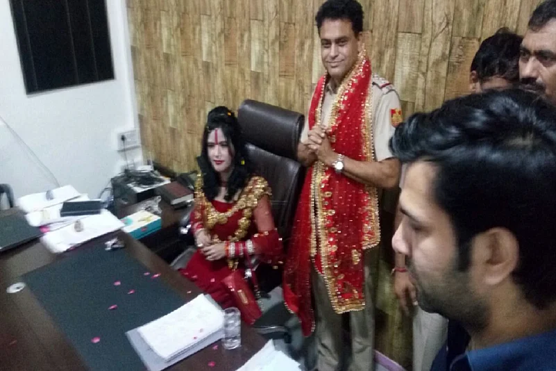 In the picture, published by news agency ANI, Radhe Maa can been sitting on a chair in the police station, while SHO Sanjay Sharma is standing next to her folding his hands and draped in red religious shawl showing obeisance.