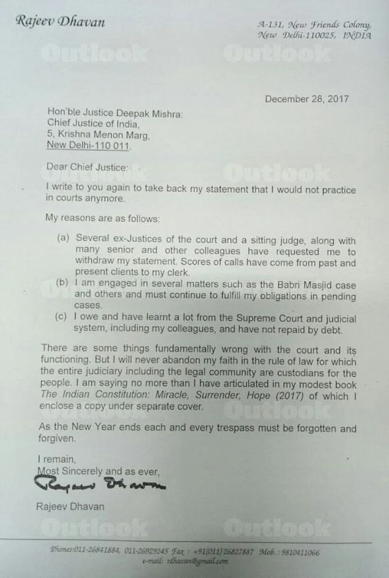 Dhavan took back his letter after at least one sitting Supreme Court judge reached out to him to resume practice. Several former apex court and HC judges had also reached out to Dhavan and expressed their dismay that the Chief Justice of India had not responded to Dhavan’s letter in any form.