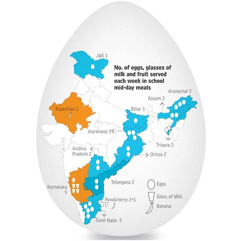 None of the 11 BJP-ruled states want to serve eggs in mid-day meals for those under-nourished children. Experts, nutritionists and officials may recommend protein- and vitamin-rich eggs as wholesome but for ‘religious reasons’ BJP chief ministers baulk at allowing them in schools. Madhya Pradesh chief minister Shivraj Singh Chouhan is the latest to join the anti-egg lobby, ostensibly because he is a vegetarian and a Hindu, but it looks like his ministerial colleagues haven’t cottoned on to which way the way the wind’s blowing. Cabinet colleague Kusum Mehdele has vowed to make the state “machhlimay” (bountiful with fish) and “kachhuamai” (replete with tortoises), even hitting the other end of the scale and certifying that frogs’ legs were indeed “tasty”. While the maps above were released by economist Jean Dreze, Chouhan is advised to look up food writer Vir Sanghvi’s tweet, which says he’s “stunned to find 87 per cent of India is non-vegetarian and even in my home state Gujarat, over 60 per cent eat meat”.