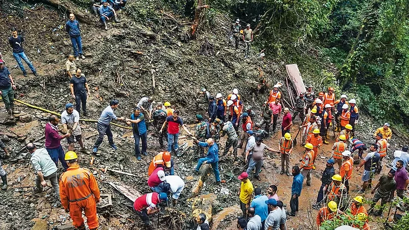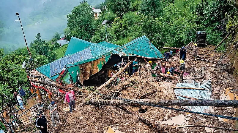 Between August 13 to 16, several high-rise buildings collapsed like a pack of flaky cards, roads cracked, opening up wide gashes in the development spiel of successive governments, as rubble, mud, stones and even the mighty deodars—large coniferous trees symbolic of the terrain—rolled down its slopes. Deodars are known for their deep root systems which have stabilised Shimla’s hillsides for decades.