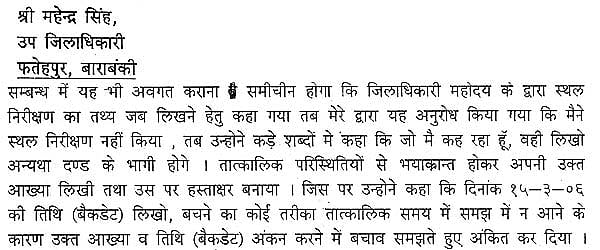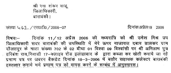 Fatehpur deputy collector Mahendra Singh’s protest letter (April 19, 2006) that he was pressurised to certify Bachchan owned land