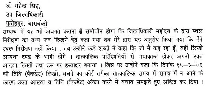 Fatehpur tehsildar A.K. Srivastav’s letter (April 13, 2006) to Mahendra Singh saying he was threatened by DM R.S. Sahu to sign a certificate favouring Bachchan