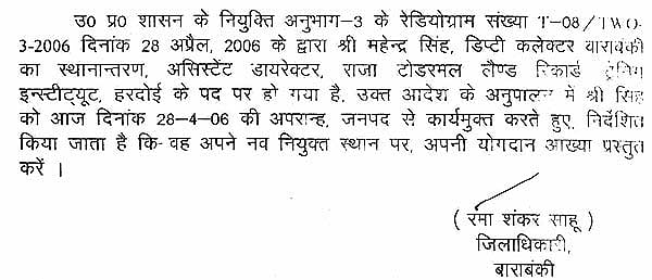 "Shri Mahendra Singh...is transferred to Raja Todarmal Land Record Training Institute, Hardoi, with immediate effect. Signed R.S. Sahu, DM, Barabanki"