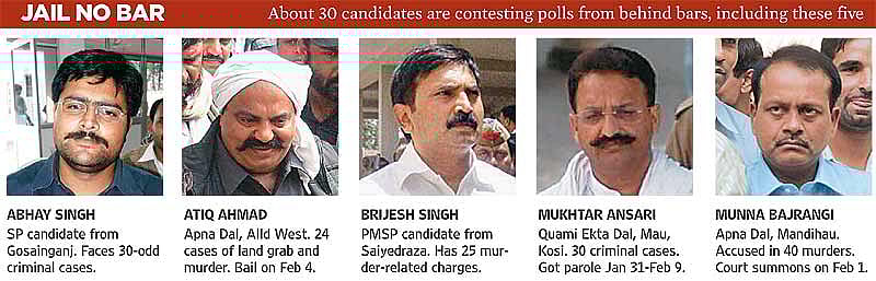 Arrested in February last year in Delhi and currently lodged in Meerut jail, Mishra’s is a textbook case of how democracy can come without the rule of law. For it matters little in the world’s largest democracy that Mishra faces, at last count, 25 criminal cases, including one of being the key conspirator behind a July 2010 blast in Allahabad that was intended to kill BSP minister Nand Gopal Nandi but one that ended up killing two others, including journalist Vijay Pratap Singh of The Indian Express. What matters most, though, is that he wields enormous money power. According to affidavits filed, he is one of the richest candidate to go to polls in the third phase with an annual income of over Rs 93 lakh and assets of over Rs 9 crore. He is also an influential Brahmin with a strong possibility of winning from Gyanpur that has a dominant Brahmin population.