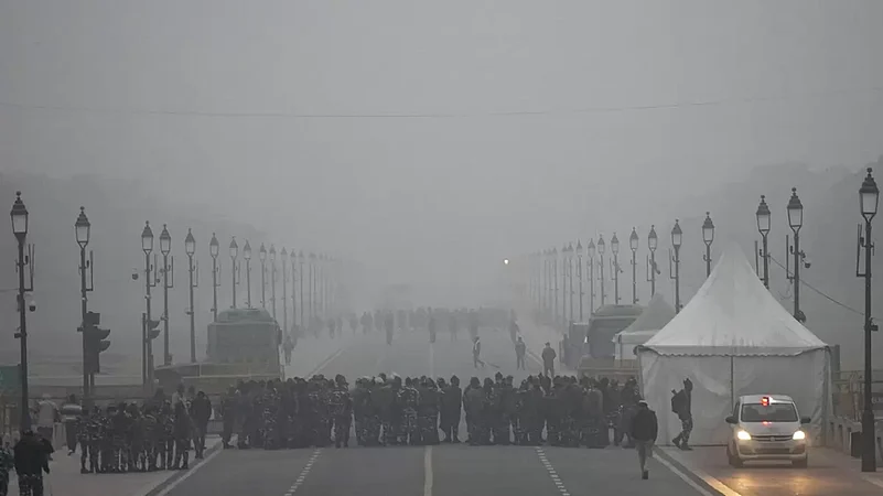 Indian military personnel rehearse to prepare for the upcoming Republic day parade amidst morning smog in New Delhi.