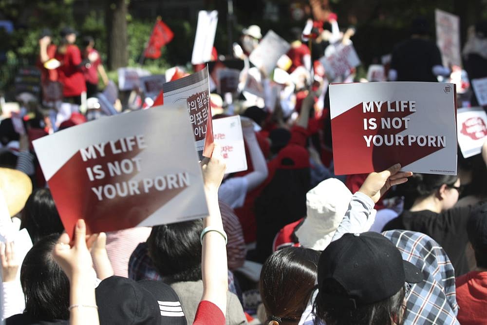 Thousands of South Korean women gathered in Seoul on Saturday to demand stronger government action against 'spy cam porn.'