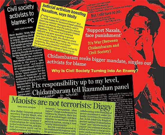 At the top of this hate list is writer Arundhati Roy. Asked about her in particular, Chidambaram told a TV channel, “She is such an eloquent writer. I wish I could write like her.” He was no less eloquent himself when he said it is civil society, to a large extent, that has weakened the efforts of the state governments in battling Maoists by questioning the government instead of questioning the Maoists. He was swiftly turning the battle between the Maoists and the state into an ‘Us vs Them’ debate by asking, and in some cases urging, people to stand up for the state.