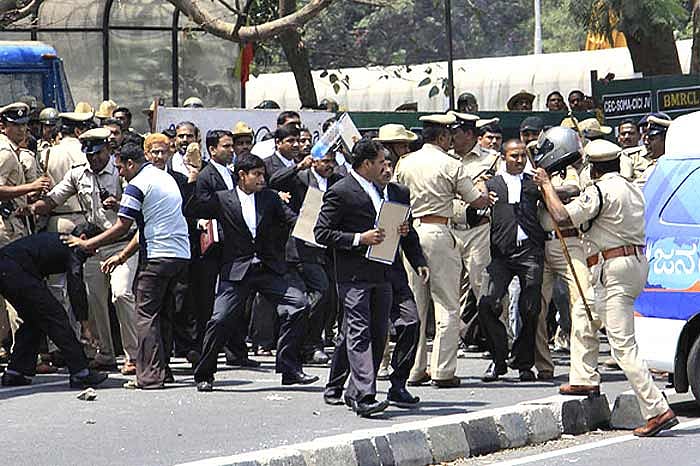 It all started on March 2, when television crews covering the appearance of mining baron Janardhana Reddy before the CBI court were attacked by lawyers. The attack was unprovoked, but certainly not without a history. It is said the media personnel retaliated, and while all this was happening, the police stood by—until they were caught in the middle, whereupon they brutally beat up the lawyers with lathis. Versions vary, depending on who you are speaking to. By all accounts, lawyers, media personnel and policemen fought for more than a couple of hours at the Bangalore city civil courts complex. In the melee, a judge, 15 policemen and ten media personnel were injured, a dozen motorbikes were burnt and some 40 cars vandalised.