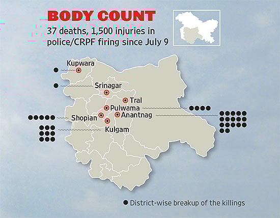 For the Mehbooba-led PDP-BJP government, the only silver lining is that Srinagar, the capital and also the headquarters of the azadi movement, has been relatively free of casualties (unlike in 2010). Still, anti-India protests and clashes were being reported from all areas of the city and mosques are blaring revolutionary songs from loudspeakers. All but three of the 37 deaths have occurred in south Kashmir, half of them in Anantnag, Mehbooba’s native district. The one death in Srinagar was in Tengpora: Shabir Ahmed, a 21-year-old mason, was chased and killed by cops near his house and in front of his father. In the 2008 and 2010 protests, the capital had had the biggest bodycount.