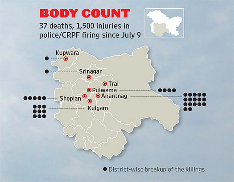 Was ‘Operation Burhan’ faultily managed? Reports and eyewitnesses say he could have been captured alive. It’s said a party of the police’s special operations group (SOG) rushed from Srinagar to Kokernag on a tipoff that he was in a house in Bumdoora village. Given the new bounty policy for killing ‘Most Wanted’ militants, they didn’t pass on the information to their counterparts in the south. Some local residents say Burhan and two associates were playing cricket in an orchard on July 8 afternoon. “When they saw the SOG vehicle approaching, they tried to run away, but they were shot dead,” says a witness. “I can tell you, the boys weren’t carrying weapons, they weren’t killed in an encounter. They were simply bumped off.” He adds that the bullet marks too indicate they were shot in the back at point-blank range.