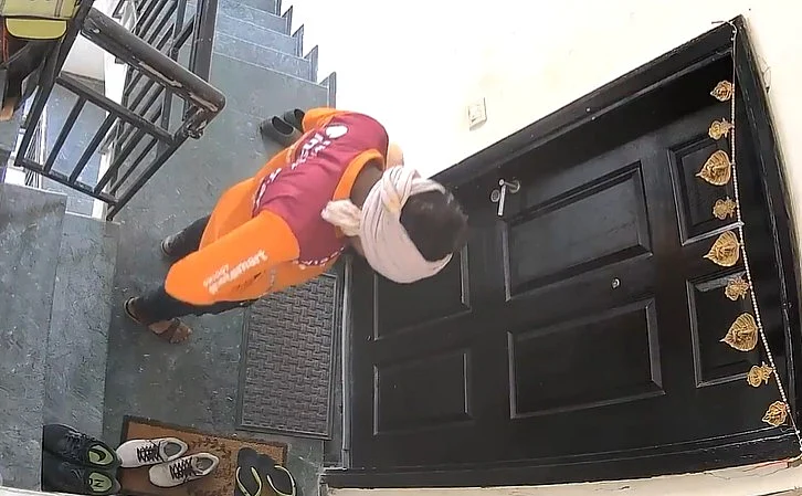 The video showed a Swiggy delivery person walk up to the door with a grocery package. The delivery person can be seen ringing the doorbell and waiting for the customer to open the door. Waiting for someone to open the door, the delivery person observes his surroundings and looks downwards, where three pairs of footwear can be seen kept.