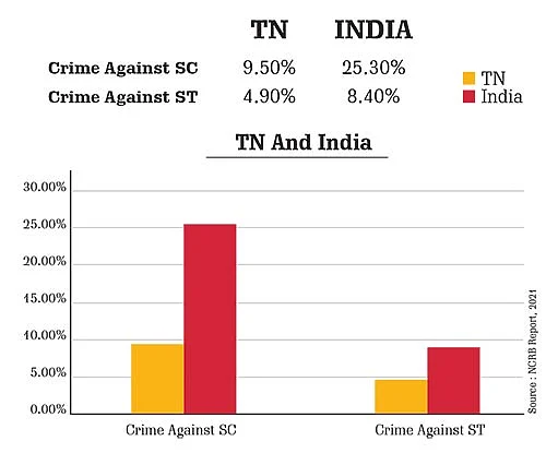Another key metric that serves as a good reference for peace and justice is crimes related to oppressed and marginalised communities, especially among the SC and ST. Tamil Nadu does exceedingly well in this. Crimes against SC is 9.5%22 in TN whereas the India figure is at a whopping 25.3%. For Crimes against ST, TN is at 4.9% performing close to two times better than the India average of 8.4%.