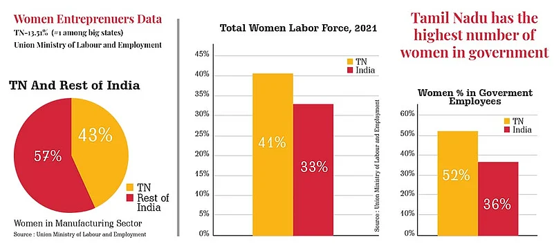 According to the Ministry of Statistics and Programme Implementation, Tamil Nadu has the highest number of women entrepreneurs, at 13.51% in India. Similarly, out of 15.8 lakh women working in the manufacturing sector of India, 6.79 lakh (43%)9 are from Tamil Nadu. It is a matter of great pride to mention that the female workforce in the Tamil Nadu government sector is 52%10, whereas India has an average of 36%. These are well-proven examples of the state’s inclusivity towards women’s upliftment.
