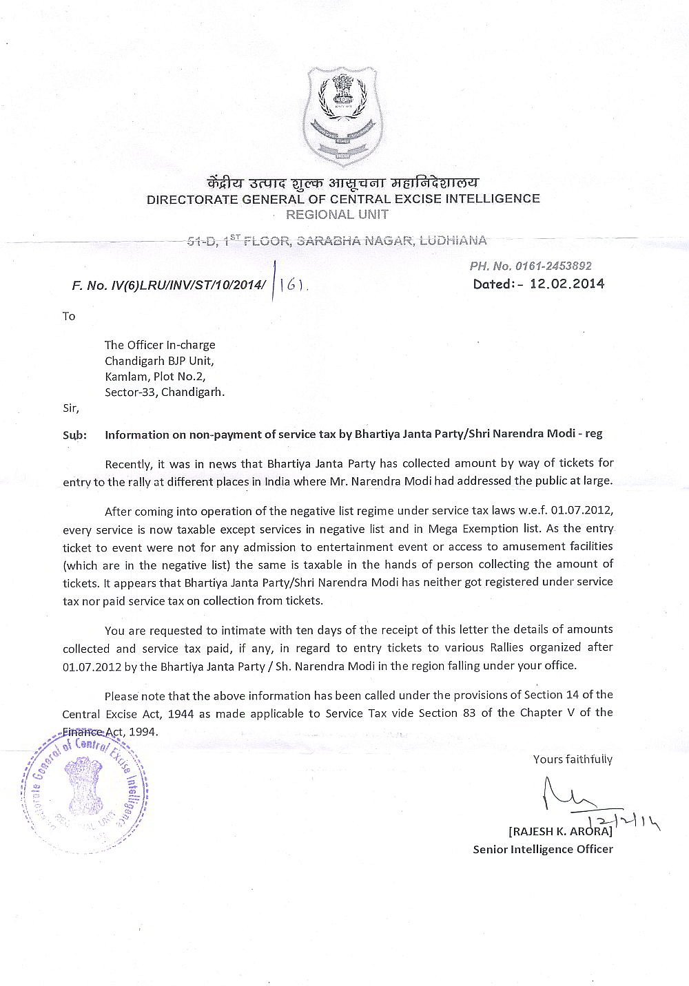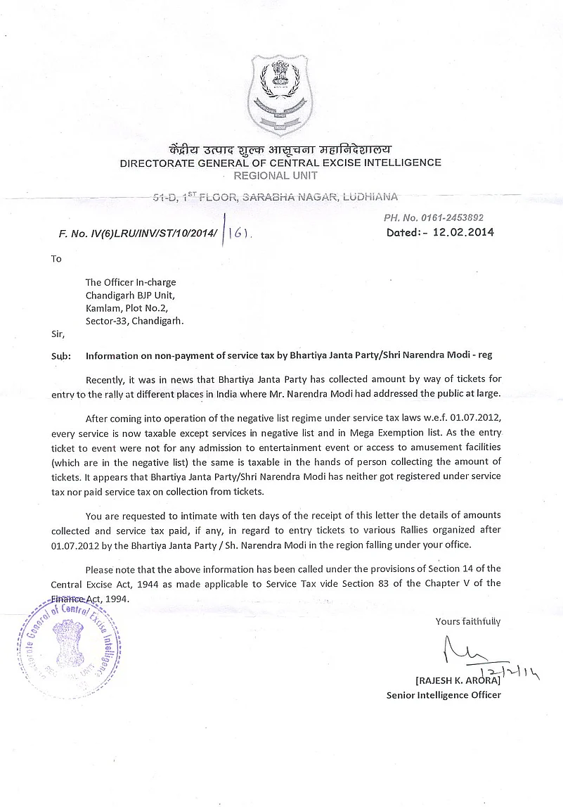 On February 12, the Directorate General of Central Excise and Intelligence has issued a letter to the BJP and its Chandigarh office. The notice mentions “as the entry tickets to the event were not for any admission to any entertainment event or access to amusement facilities (which are in the negative list) the same is taxable in the hands of the person collecting the amount of tickets. It appears that the BJP/Shri Narendra Modi has (sic.) neither got registered under the Service Tax nor paid tax on collection from tickets”. The notice, therefore, desires that the details of the alleged entry tickets to Modi’s rallies should be furnished immediately for calculation of service tax payable by Shri Narendra Modi or the BJP. The Chandigarh unit of the BJP has not organized any rally of Narendra Modi as yet.