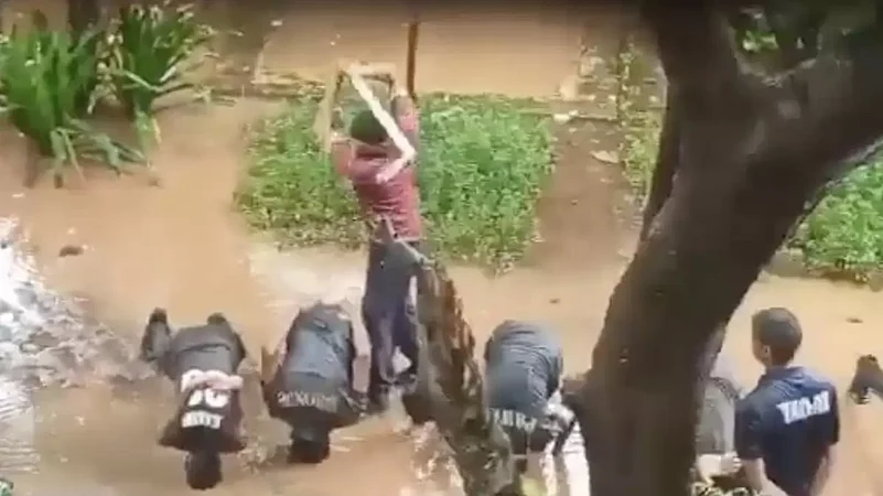 The cadets are seen in a push-up position in a water-logged area with their feet and head touching the ground and hands folded above the back. When a cadet changes posture, the senior student is seen thrashing him with a stick and going on to thrash others too. While earlier, the person thrashing the students was assumed to be the NCC instructor, the principal clarified that it was a student.