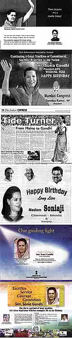 For a Congress president who wanted to keep her birthday a low-key affair, it turned out to be an unforgettable party: Union ministers, chief ministers and governors lined up to pay their homage. Union home minister Shivraj Patil declared the day as Tyag Divas, likening Sonia Gandhi to Buddha, Ashoka and Gandhi. Party workers broke into song and dance under the gigantic vinyl billboards hailing her as "Saint, Mother, Mother India, Guide and Pride".
