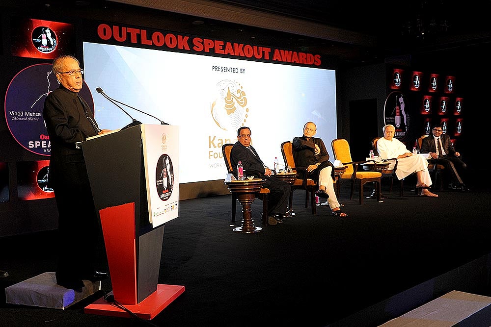 The men who took centrestage at the SpeakOut Awards in a sense bear testimony to Outlook’s tradition of neutrality—set in place by the independent-minded journalism the magazine endorses and practises. Former President Pranab Mukherjee, a veteran Congressman, was chief guest, and former Vice-President Hamid Ansari, scholar and career diplomat, too graced the occasion. Pranab sat flanked by Arun Jaitley, who not only handles key ministries in the present BJP-led government but has been a long rival of Mukherjee’s in parliamentary debates, and Orissa chief minister Naveen Patnaik of the BJD, who’s on a third side of the political spectrum. Jaitley received the award in the Best Parliamentarian category and Patnaik as the Best Administrator, particularly for bringing poverty down, ensuring growth, making Orissa a major rice producer and for his handling of the situation arising out of the cyclones that hit the coastal state.