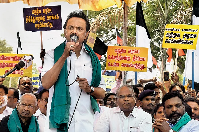 The DMK working president could have remained satisfied with the April 5 bandh demanding the immediate formation of a Cauvery Management Board. That protest had seen the state grind to a halt—and the DMK could claim credit for bringing together the Opposition and farmers’ outfits in organising the bandh. But the DMK scion needed to keep the Cauvery pot boiling as long as it was possible. “One main reason is guilt,” reasons political commentator Raveenthran Duraisamy. “Because Cauvery became a dispute in 1974 when the DMK was ruling and Karunanidhi was the chief minister. History shows that Tamil Nadu’s claim got compromised at this stage. So Stalin had to atone for his father’s mistake. He cleverly used the present crisis to emerge as the saviour of Cauvery and farmers.”