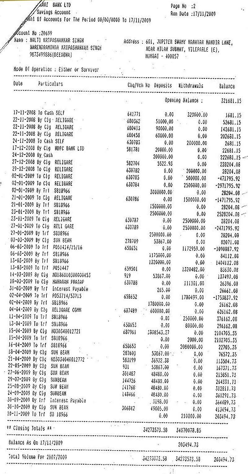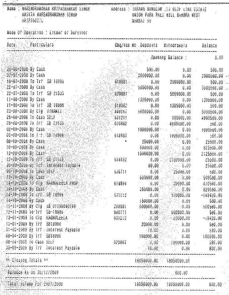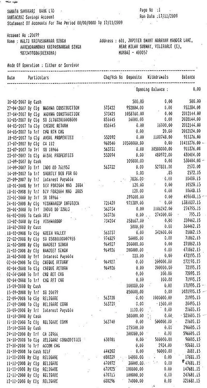 - A/c number 20699, with Samata Sahakari Bank Ltd (Santa Cruz East branch), shows deposits ranging from Rs 1 lakh through Rs 2 lakh and Rs 5 lakh and up to Rs 25-30 lakh on each occasion. One deposit on July 17, 2007, is for Rs 1.05 crore. This account is jointly held by Maltidevi Kripa Shankar Singh and Narendra Mohan Kripa Shankar Singh.