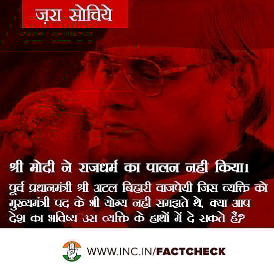 No leader in the BJP can match the stature of former Prime Minister Shri Atal Bihari Vajpayee. The founding president of the party, Shri Vajpayee was the Prime Minister of India from 1998 until the NDA was defeated by the Congress-led United Progressive Alliance in 2004. Shri Vajpayee was clear what was the reason for the defeat: Gujarat Chief Minister Shri Narendra Modi's failure to control the communal pogrom in his state in 2002.