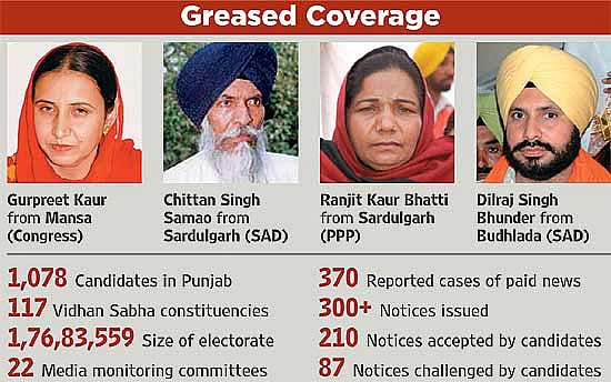 Many a media house based in Punjab has been rattled by the Election Commission’s first-time effort to curb paid news. Nevertheless, media watchers say what has been exposed is just the tip of the iceberg. “The flip side of the EC’s strictness in accounting for advertisements put out by candidates is that now there are very few candidates’ ads in newspapers or on TV channels,” says Kanwar Sandhu, managing editor of Day & Night News, a TV channel. “Instead, candidates either pay local correspondents or get paid news inserted.”