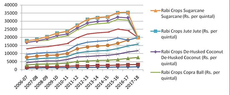 The government of Maharashtra has not fully accepted all the demands, avoiding decisions on certain core areas with promises to set up committees. It has agreed to implement the FRA and continue waiving loans because these are existing programmes. The Swaminathan Commission proposed a minimum support price that would be at least 50 per cent over and above the cost of production; this was not acceptable to the government—and instead of actually moving to implement it following the long march, it has merely set up a committee to consider the matter. It is also important to note that the minimum support price as calculated according to the current method fails to reflect the frequent fluctuations in the cost of production, and has failed to keep up with the latter. Figures 1 and 2 show how the minimum support price for various crops has only seen marginal increases year-on-year, which is not enough to match cost-push inflation. Thus, a more efficiently calculated support price that moves in lockstep with this inflation is required.